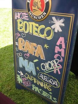 O espaço escolhido foi um sítio, mas a decoração ficou por conta do buffet: mobiliário típico de boteco, com lousa com nome dos noivos, mesas de boteco, descanso de chopps, toalhas customizadas etc.